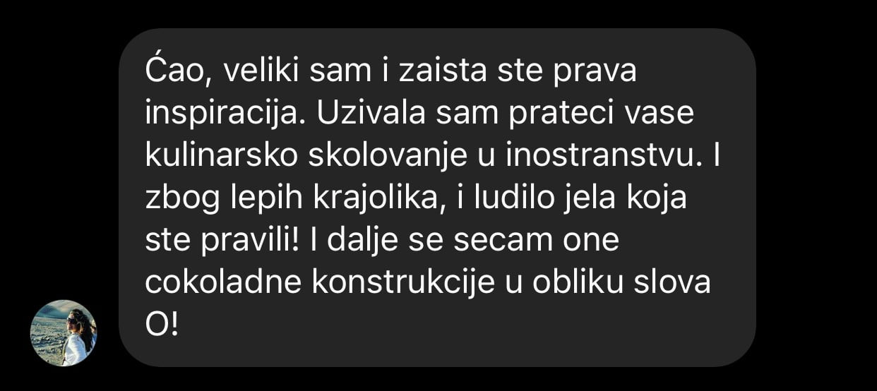 Upravo rad u najboljem fine dininig restoranu na svetu Guy Savoy (Paris, 3 Michellin zvezdice), gde sam i stekla titulu Chef cuisinier, naučio me je i tome da je svrha i filozofija kuvanja zasnovana upravo na deljenu sa drugima. Iz dana u dan, posao je pred mene postavljao novi izazov, a cilj se uvek svodio na isto – svakim zalogajem zadovoljiti očekivanja vrsnih hedonista i gurmana!